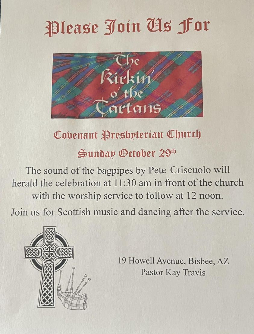 First Presbyterian Church will worship in Old Bisbee at Covenant Presbyterian Church this Sunday October 29, 2023! See INFO below. IMPORTANT: There will be food after the service provided by the members and friends of Covenant Church.